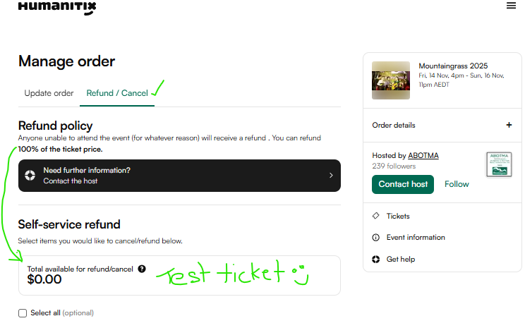 Can't find your ticket confirmation email? Try searching for ABOTMA as the sender or order@humanitix.com. If you can’t find your ticket, click the ‘Contact Host’ button on the event page, select “Can’t find my ticket/invoice” and fill out the form. Humanitix will automatically resend the tickets if they can find your order.