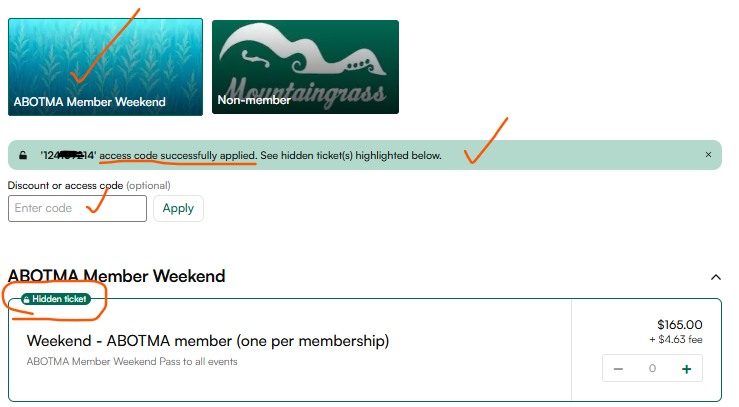 Weekend Tickets: Enter the Member Number from the membership card into the access code field in Humanitix to see and purchase ABOTMA Member weekend tickets.
